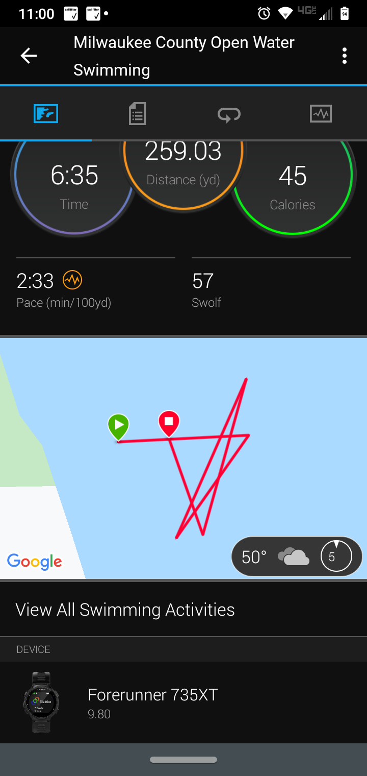Luna Laguna and I showed up late. LL made a badass SKIN swim to sewerpipe, and I swam skin for two laps around the rockpile, which apparently always turns into a star when you see the Garmin map (below), so perhaps I should stop being so delighted by that.